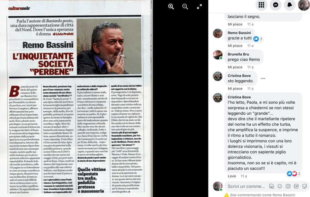Così, cazzeggiando su facebook dopo aver controllato la posta elettronica (nessuna nuova) e le classifiche dei miei libri (in particolare La suora) su Amazon (vendite da depressione) mi ritrovo sul profilo di una mia amica argentina, si chiama Mirta, che ha postato una foto che le hanno scattato al mare mentre sta leggendo La suora, e così, dopo averla ringraziata, guardo distrattamente le sue foto e, tornando indietro, scopro di averla taggata – era il 20 novembre del 2020 – quando postai, sul mio profilo, la recensione al libro Bastardo posto che Livia Profeti scrisse su Left.